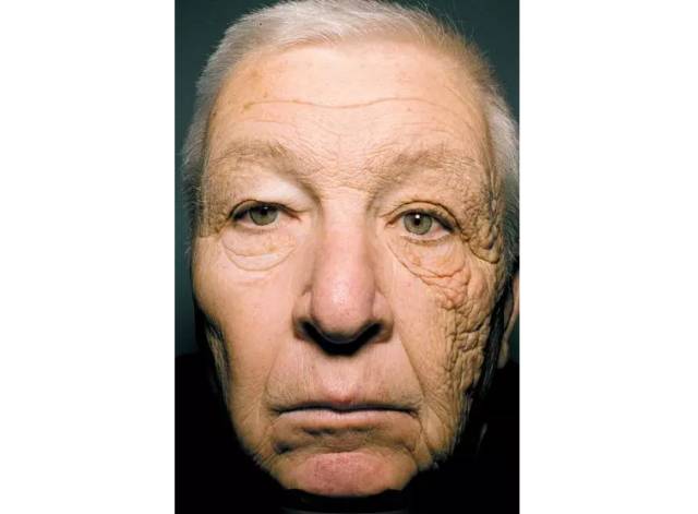 圖中的這個老年男性是美國一名從業(yè)超過30年卡車司機(jī),拍這張照片的時候69歲,但是老人的左臉看起來卻像是80歲,整整比右臉看上去老了將近20歲。嚴(yán)重的情況使得老人不得不就醫(yī)。