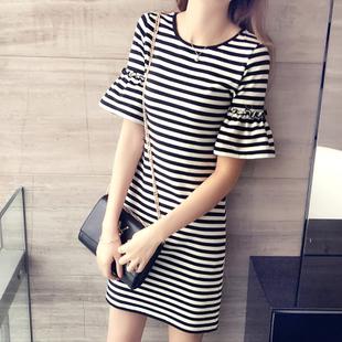 春夏裝新款韓版修身顯瘦荷葉袖短袖女式T恤中長款女士條紋連衣裙