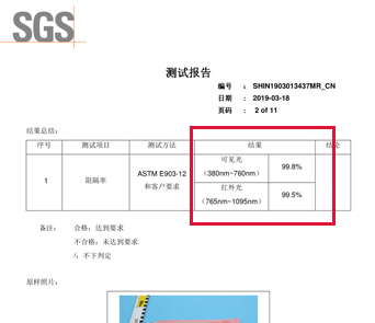 素湃防曬衣自稱(chēng)全波段防曬,在相關(guān)檢測(cè)機(jī)構(gòu)的檢驗(yàn)報(bào)告上,無(wú)論是紅外光還是可見(jiàn)光的阻隔率都在 99.5% 以上。