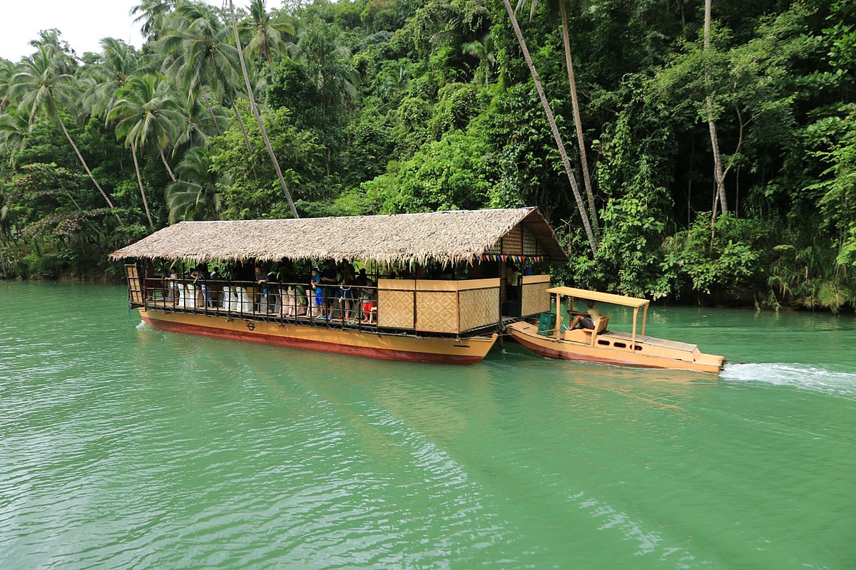 搭乘游竹筏編成的小船,在Loboc River上航行,沿途欣賞熱帶叢林風(fēng)光,船上會提供海鮮自助吧,雖然樣式不算多,但搭配著河景就很有東南亞風(fēng)味的愜意舒暢感。到達(dá)中間一處中繼平臺會有當(dāng)?shù)鼐用癯琛⑻韫┯慰托蕾p,有時也會邀請游客一同歌舞。