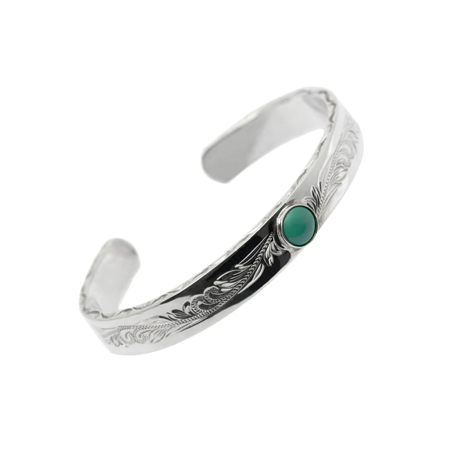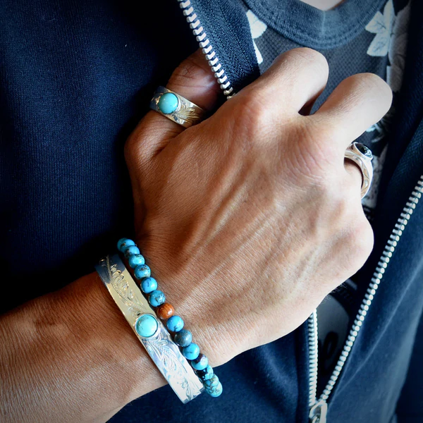 不過真正讓我選擇它們家的原因,其實還是在于“年輕”所帶來的創(chuàng)新性。就譬如這款銀手鐲,不僅顯著地嵌有一顆綠松石,還一反傳統(tǒng)地大量減少了裝飾花紋,只保留較簡單的波浪與花瓣紋路,使留白處增強(qiáng)了整體的光澤感。個人覺得這只手鐲即使不搭配其它配飾共同呈現(xiàn)也已足夠亮眼~