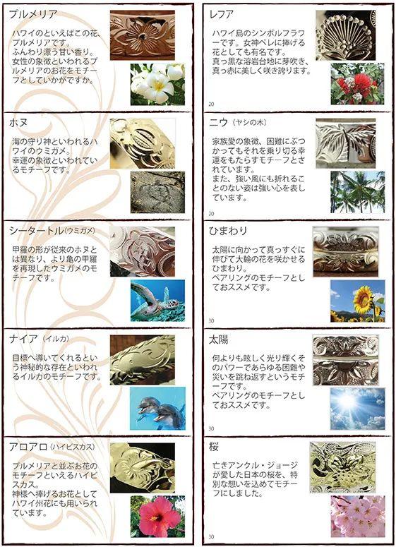 之所以說 Hawaiian Palms Jewelry 的產(chǎn)品足夠地道,是因為這一品牌對于夏威夷珠寶的花紋及圖案設(shè)計極其講究。除了幾種常見的花紋樣式,Hawaiian Palms Jewelry 還將當(dāng)?shù)刂拿{凱亞火山、多型鐵心木、尤克里里等你能想到的所有夏威夷文化象征都化為了一個個符號,賦予在珠寶當(dāng)中。打開它們的官網(wǎng)更是能看到大量關(guān)于夏威夷珠寶的歷史背景,以及各類花紋樣式含義的圖鑒與資料。
