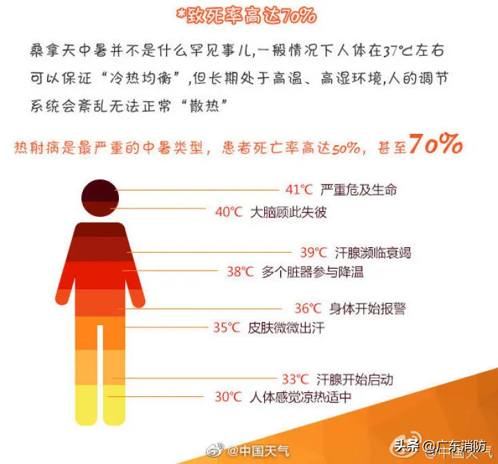 熱射病是由于人體受外界環(huán)境中熱原的作用和體內(nèi)熱量不能通過正常的生理散熱,以達(dá)到熱平衡,導(dǎo)致體內(nèi)熱蓄積,引起體溫升高。發(fā)病初期,通過下丘腦體溫調(diào)節(jié)中樞,加快心排血量,加快呼吸,擴(kuò)張皮膚血管,出汗等散熱。如果致熱因素沒有去除,體內(nèi)熱進(jìn)一步蓄積,體溫調(diào)節(jié)中樞失調(diào),會(huì)導(dǎo)致心功能減退、汗腺衰竭等。體溫達(dá)41℃以上可導(dǎo)致蛋白質(zhì)變性,超過50℃數(shù)分鐘細(xì)胞即可死亡。