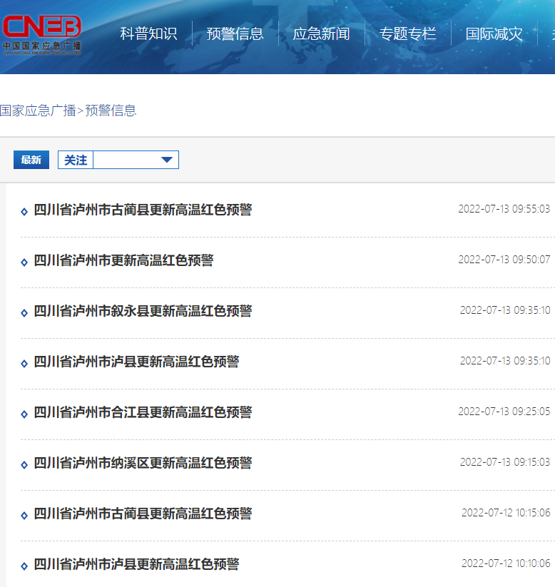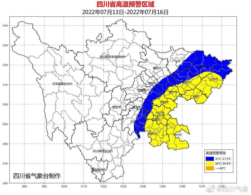 四川省氣象臺(tái)7月12日16時(shí)繼續(xù)發(fā)布高溫藍(lán)色預(yù)警:7月13日到16日,廣安、達(dá)州、巴中、南充、遂寧、資陽(yáng)、內(nèi)江、自貢、宜賓、瀘州10市和廣元、綿陽(yáng)、德陽(yáng)、成都、眉山、樂(lè)山6市東部日高氣溫可達(dá)35°C或以上,其中部分地方將超過(guò)38°C。