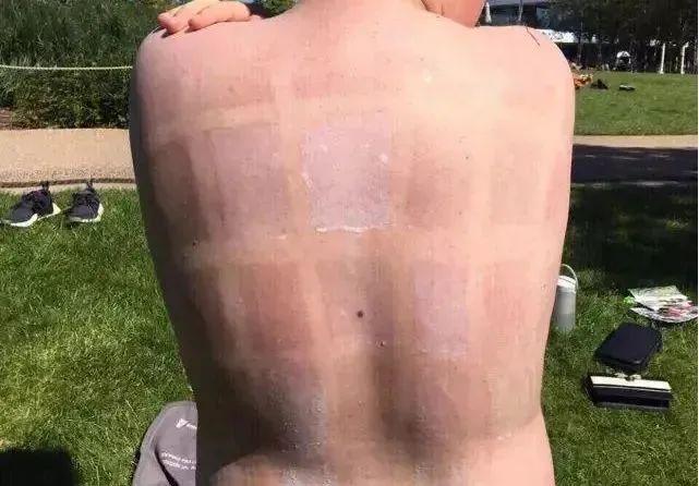 一外國(guó)男子曾做過(guò)關(guān)于防曬的實(shí)驗(yàn),如下圖。他把他的背分為15個(gè)區(qū)域涂上不同的防曬霜,結(jié)果發(fā)現(xiàn)貼膠帶的地方白,這說(shuō)明了什么?衣服才是阻擋紫外線(xiàn)有的手段。