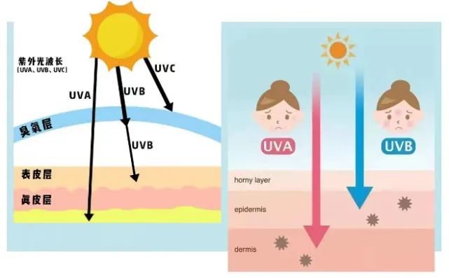 UVA 的波長(zhǎng)比較長(zhǎng),穿透能力強(qiáng),可以深入以下組織、破壞膠原蛋白、損傷細(xì)胞 DNA,從而將皮膚曬黑 。UVA 還能夠加速皮膚的老化,嚴(yán)重可能導(dǎo)致皮膚癌。