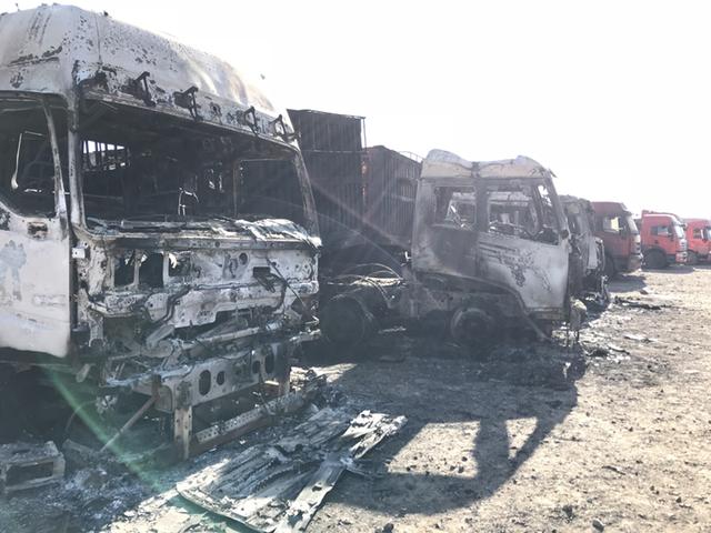 海珀?duì)柵赃呁\?chē)場(chǎng)內(nèi),多輛大貨車(chē)被燒毀,車(chē)場(chǎng)玻璃熔化