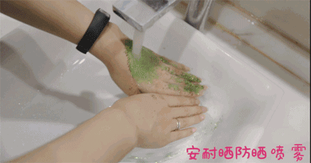 自己做個小實驗,發(fā)現(xiàn)TA的防水好到:噴過安耐曬防曬噴霧的手上的亮片都沖不走!