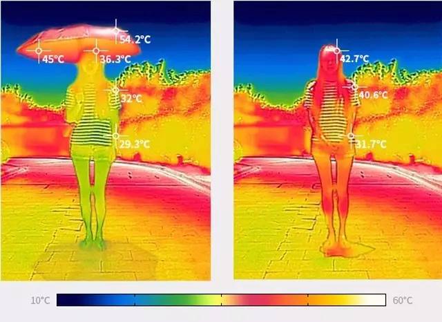 圖為站在小黑傘下與暴曬在陽(yáng)光下的溫度對(duì)比