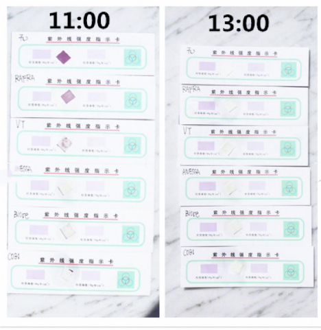 五款防曬的防曬力測試。小編用了一個紫外線測試卡來檢測防曬力。在測試卡上噴防曬,然后在陽光下曬,測試紙分子結(jié)構(gòu)變化會引發(fā)紙變紫,防曬力越好,紙?jiān)讲蛔兩?,或者少變色。所以五款防曬?jīng)過2個小時的暴曬檢測后,防曬力從優(yōu)到差:ANESSA=COGI>Biore>VT>RAFRA