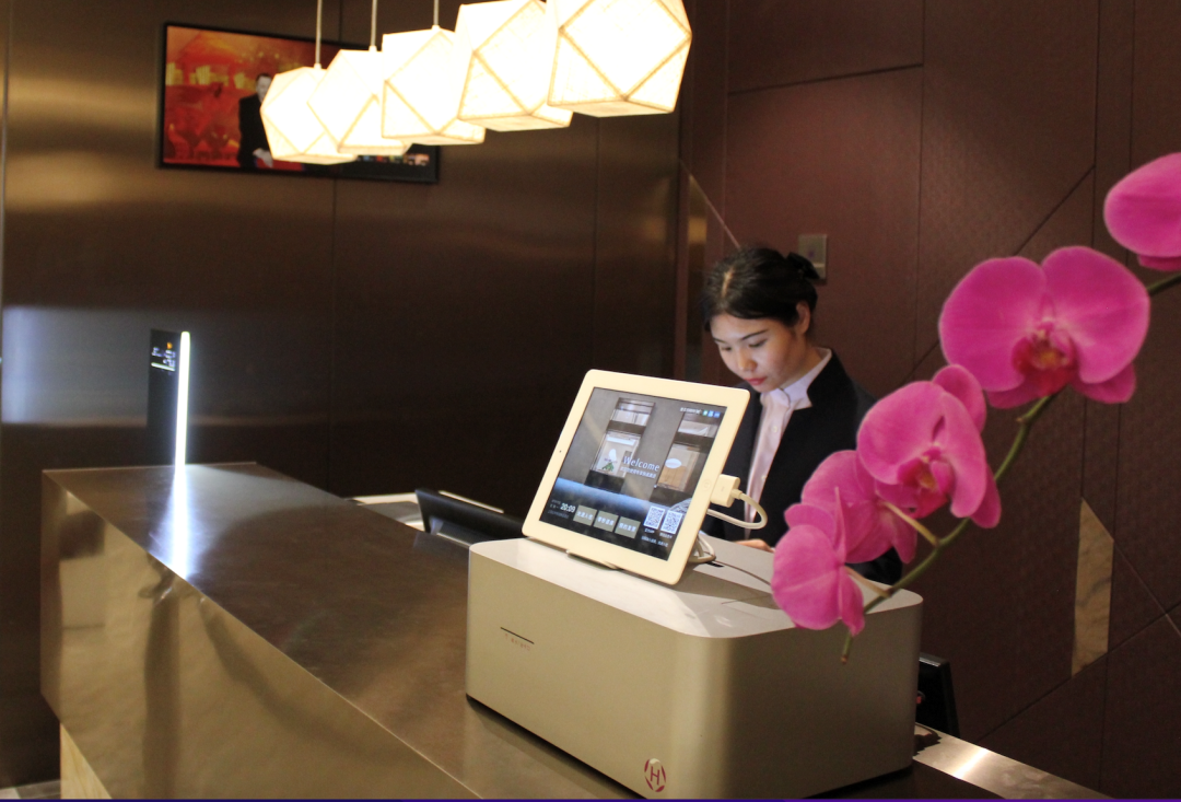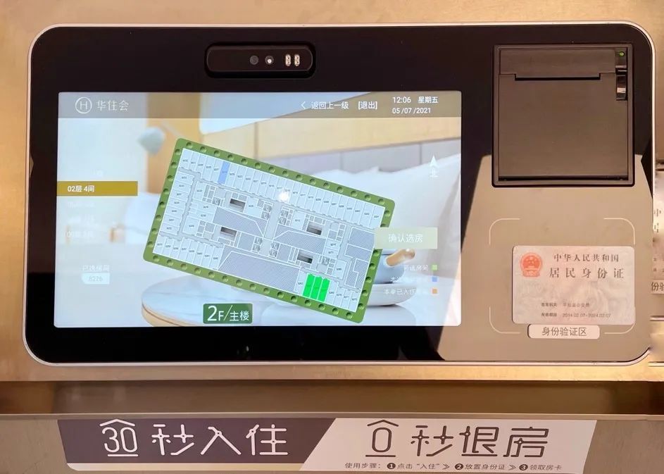 不久,華住1300多家門店陸續(xù)出現(xiàn)了類似iPad的自助終端 ,右側(cè)有身份證刷卡槽,用于門店自助辦理入住。用戶可以通過這臺終端完成預(yù)定、選房和支付流程,后到前臺取卡和發(fā)票。