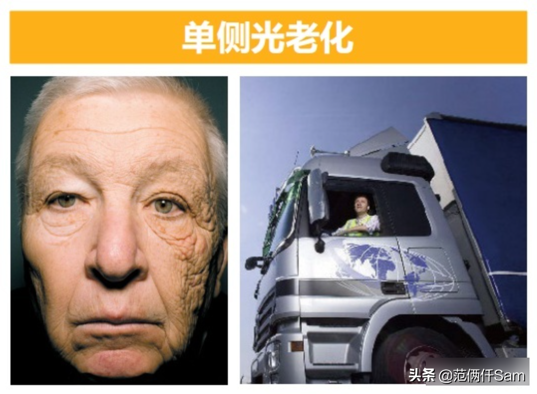 尤其是我們的臉部肌膚,下圖是一個常年在左側(cè)暴曬中開車的卡車司機(jī),可以看到臉上皮膚的衰老程度都有的對比變化。