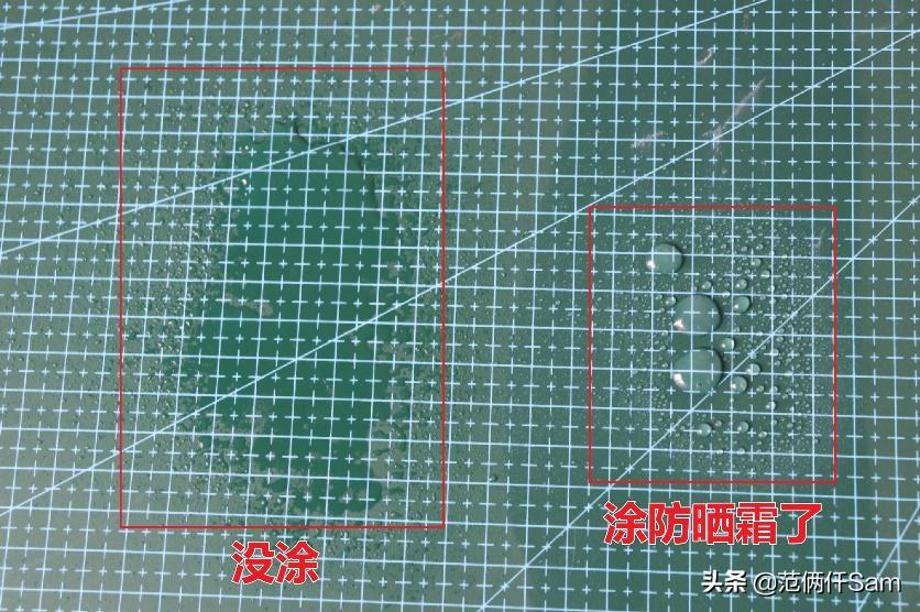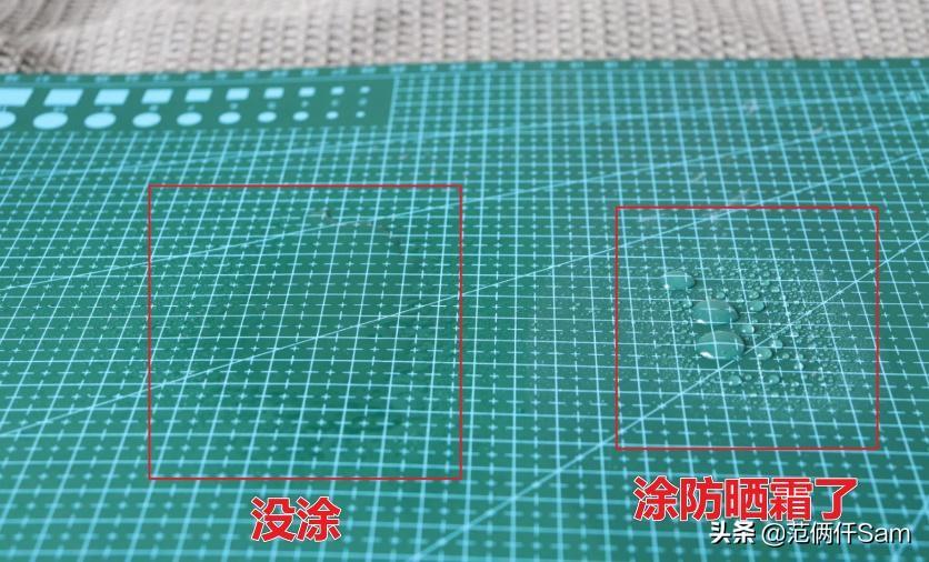 在涂了防曬與沒涂防曬的地方都噴一點(diǎn)水,涂防曬的地方簡直好像有疏油層一樣,