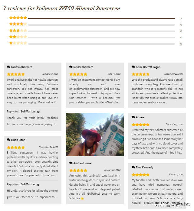 “我工作和生活在霍克斯灣炎熱的陽光下,已經(jīng)愛上Solimara防曬霜了。它不油膩,覆蓋面廣,聞起來很香。我在使用它的時候從來沒有被灼傷過,而且喜歡它易于使用的包裝。高質(zhì)量的產(chǎn)品價格也十分劃算?!?/span>