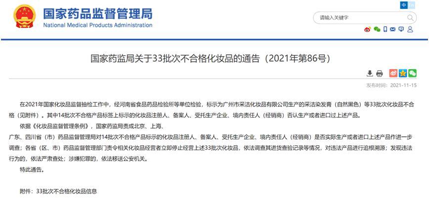 (人民日報健康客戶端 邱越)11月15日,藥監(jiān)局發(fā)布關(guān)于33批次不合格化妝品的通告(2021年第86號)。通告稱,經(jīng)河南省食品藥品檢驗所等單位檢驗,標(biāo)示為廣州市采潔化妝品有限公司生產(chǎn)的采潔染發(fā)膏(自然黑色)等33批次化妝品不合格,涉及紐西之謎、資生堂等品牌。