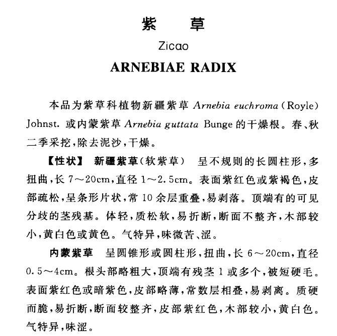 紫草:藥理活性與毒性并存我們先來認識一下紫草。紫草,廣義而言是一個包含100余屬、2000余種的植物科,即紫草科。分布于世界的溫帶與熱帶地區(qū),中國有48屬、269種。根據(jù)《中國藥典》(2010版)的收錄信息,中國藥用紫草指的是,基原為紫草科植物新疆紫草Arnebia euchroma (Royle) Johnst.或內(nèi)蒙紫草Arnebia guttata Bunge的干燥根,“用于血熱毒盛,斑疹紫黑,麻疹不透,瘡瘍,濕疹,水火燙傷。”