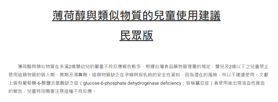 薄荷醇,又名薄荷腦,俗稱薄荷油,為薄荷、綠薄荷所含揮發(fā)油的主要成分。能夠引起皮膚、黏膜血管收縮,從而達到清涼、止癢、止痛、局部麻醉、抗炎等作用。然而,對于敏感肌膚來說,薄荷醇的刺激性可能會導(dǎo)致過敏反應(yīng)。另外,過量攝入薄荷醇會影響神經(jīng)系統(tǒng)的發(fā)育,可能引起癲癇、意識障礙、呼吸抑制等不良反應(yīng)。臺灣兒科醫(yī)學會指出,薄荷醇與類似物質(zhì)在未滿2歲嬰幼兒的嚴重不良反應(yīng)報告較多,應(yīng)禁止薄荷醇與類似物質(zhì)的吸入劑、擦劑及滴鼻劑用于未滿2歲的嬰幼兒。