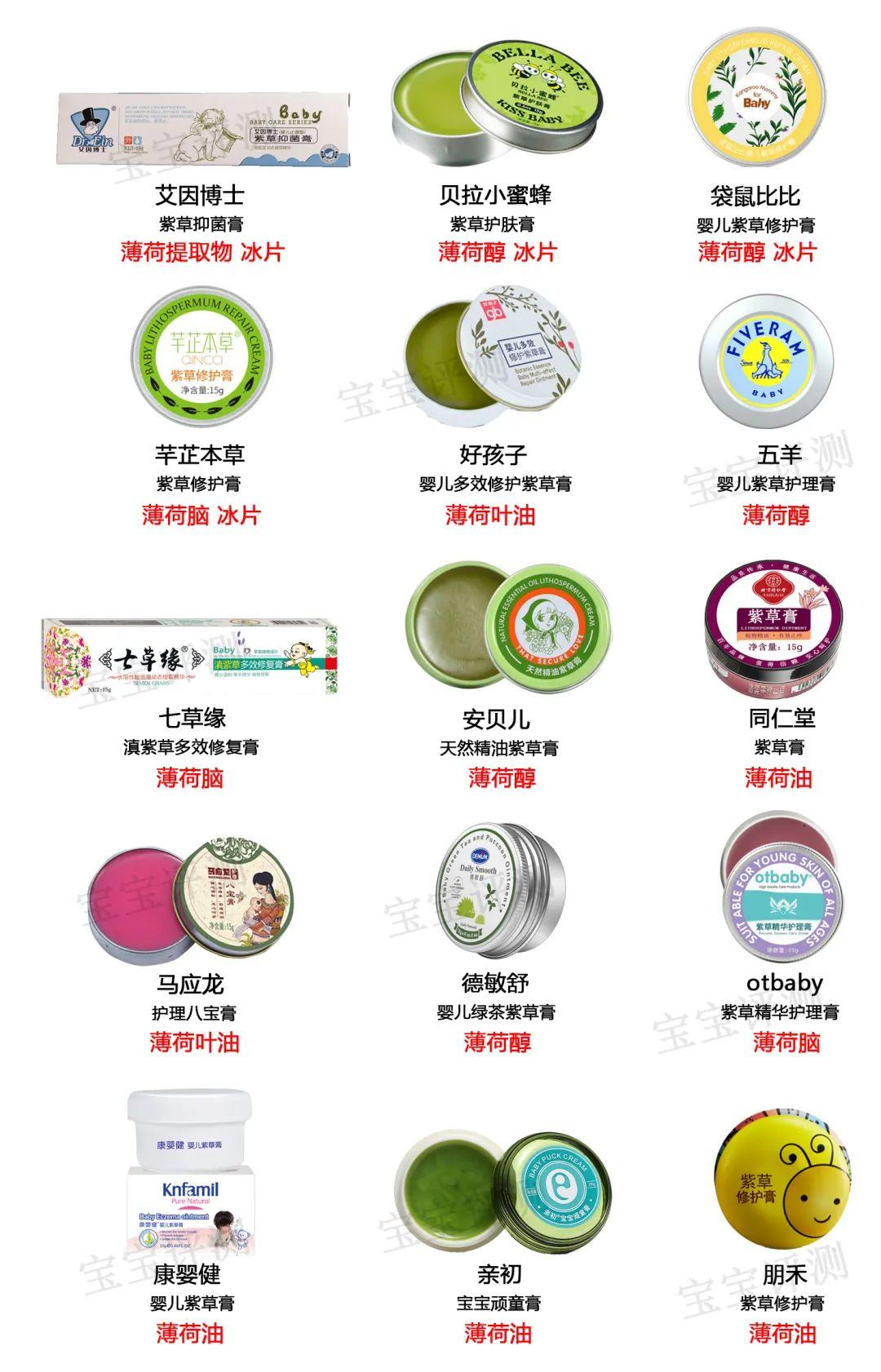 除了薄荷醇、冰片外,紫草膏中還可能含有一些致敏成分,比如:長鏈尼泊金酯類防腐劑(羥苯丙酯等)、香精、醋酸氯己定等。這些成分有的普通寶寶霜中也會添加,笨爸爸此前詳細科普過,寶媽們可以點擊這篇文章了解詳情:51款寶寶面霜評測(上):敏感肌膚需注意這33款