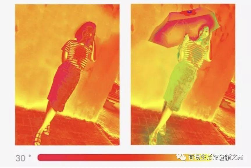 左:正常體感陽光下暴曬的溫度,右:MOLSSI雪糕傘下的體感溫度