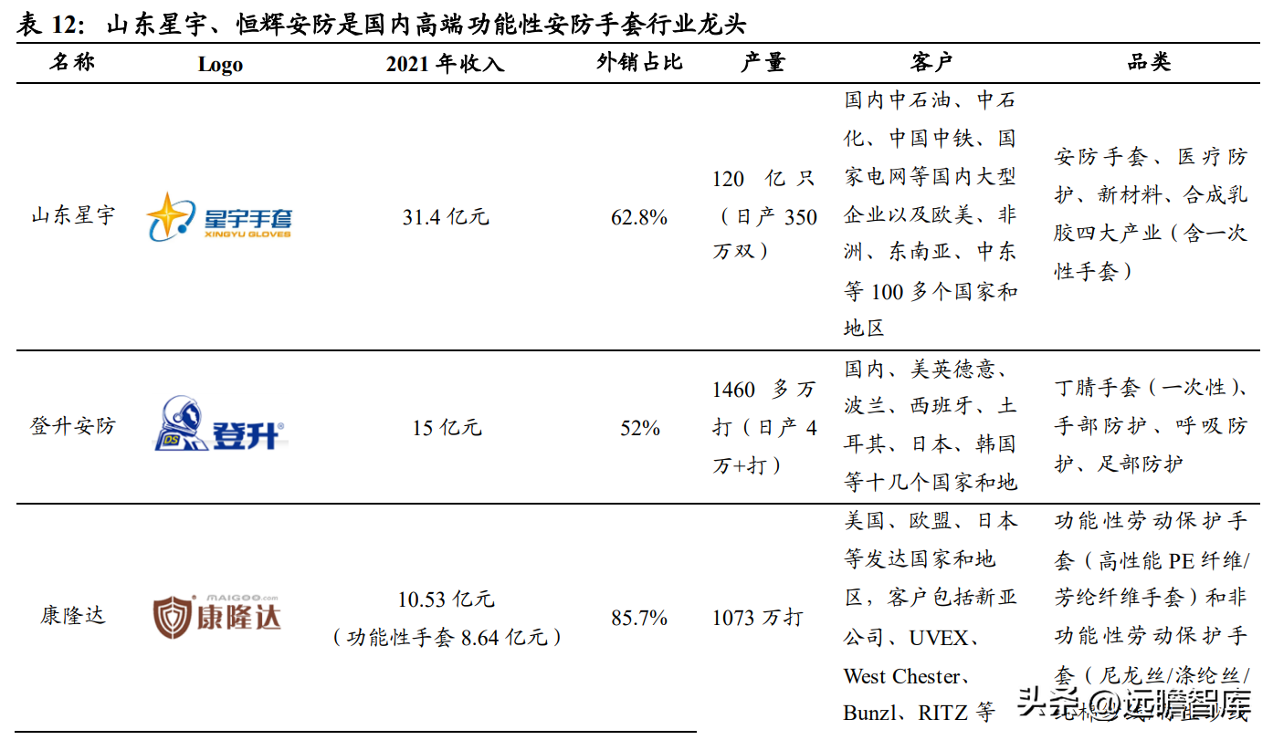 目前,國內(nèi)制作高性能功能性手套的中大型企業(yè)主要包括 山東星宇、登升安防、康隆達(dá)和恒輝安防等;其中,2021 年恒輝功能性手套收入為 9.31 億元,位列第四名,其外銷收入為 8.91 億元。
