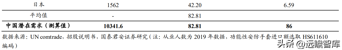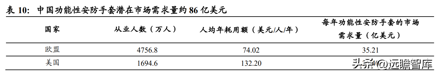 目前,我國人該類行業(yè)從業(yè)人員數(shù)量預(yù)計為 1.03 億人,若能夠達(dá)到歐盟、美國、日本等的人均針織類安防手套消費標(biāo)準(zhǔn),我們預(yù)計我國功能性安防手套每年的需求量將達(dá)到 86 億美元,潛在市場空間廣闊。