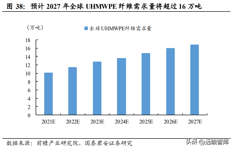 根據(jù)中國化纖工業(yè)協(xié)會及前瞻產(chǎn)業(yè)研究院數(shù)據(jù),預(yù)計 2021 年 UHMWPE 纖維的需求量超過 10 萬噸,且主要集中在高端領(lǐng)域;未來隨著 UHMWPE 纖維應(yīng)用逐漸拓展,預(yù)計 2027 年 UHMWPE 纖維需求量將超過 16 萬噸。