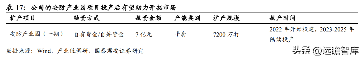 2022 年 4 月,公司成立子公司恒越安防,由其實施建設(shè)安防產(chǎn)業(yè)園項目(一期),即“年產(chǎn) 7200 萬打功能性防護手套建設(shè)項目”。2022 年 6 月,產(chǎn)業(yè)園項目順利奠基,預(yù)計未來三年將逐步投產(chǎn),幫助公司開拓內(nèi)銷市場及海外新興市場。