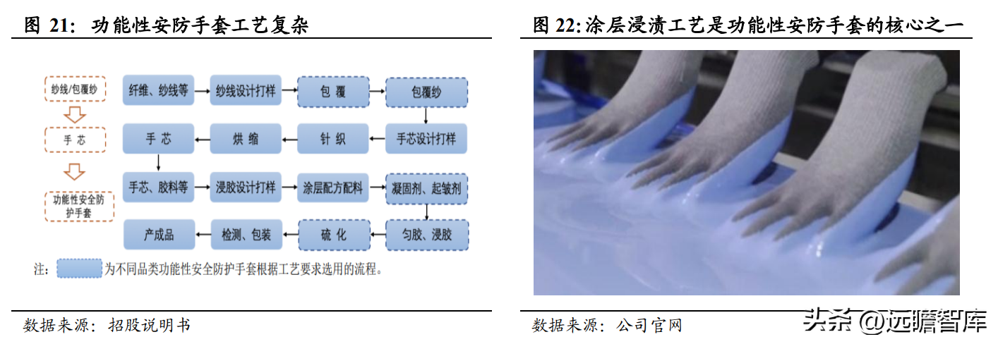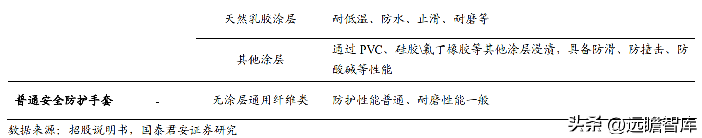 1)功能性安防手套:在針織手套表層通過特定工藝添加涂層浸漬,通過采用不同的紗線材質(zhì)、涂層配方及浸漬工藝,可提升防切割、防震等防護性能,應(yīng)用場景較廣;