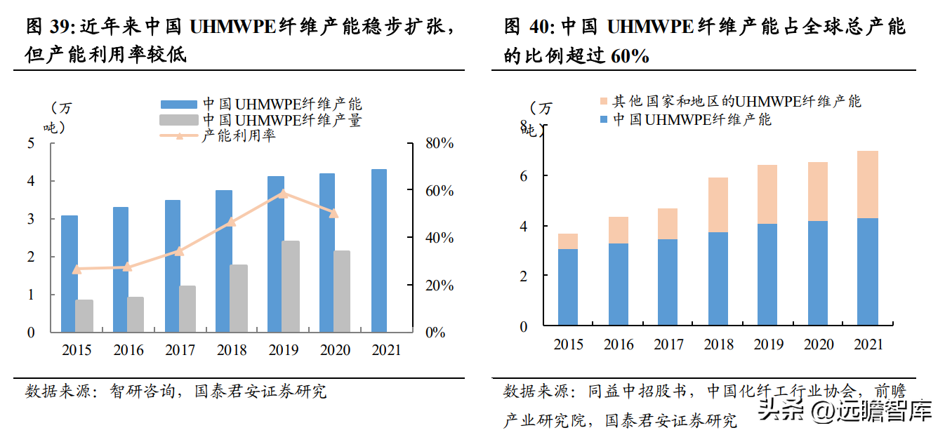 從國內(nèi)市場來看,2015-2021 年我國 UHMWPE 纖維產(chǎn)能持續(xù)擴張,由 3.05 萬噸增長至 4.29 萬噸,目前占總產(chǎn)能的比例超過 60%。但由于業(yè)內(nèi)產(chǎn)量在 2000 噸以上的中大型企業(yè)較少,小規(guī)模企業(yè)眾多,開工率處于較低水平,因此行業(yè)的產(chǎn)能利用率尚不足 60%,市場需求缺口較大,未來潛在空間廣闊。