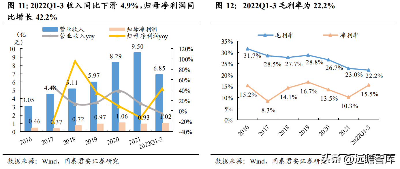 2022Q1-3 在 經(jīng)濟形勢嚴(yán)峻及國內(nèi)疫情散點多發(fā)等不利因素影響下,公司收入下滑 4.9%,但受益于政府補貼及匯兌收益增加,歸母凈利潤同比增長 42.2%,扣非歸母凈利潤同比增長 4.6%。