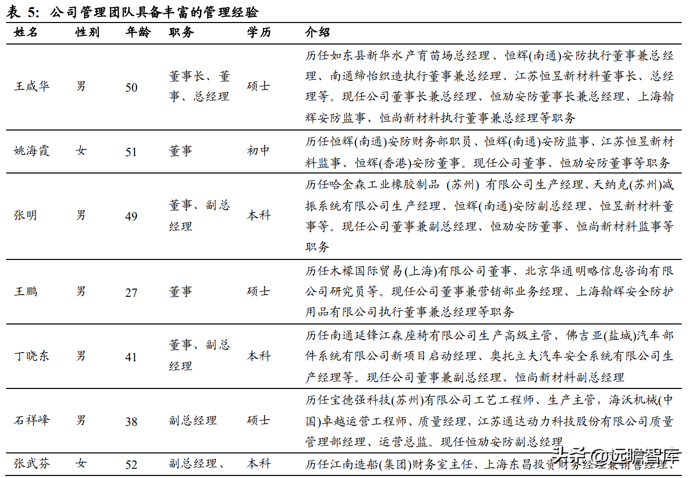 公司董事長王咸華自 2004 年創(chuàng)立恒輝(南通)防護用品有限公司以來,至今從業(yè)已近 20 年,在安防手套領(lǐng)域積累了豐富的管理經(jīng)驗。