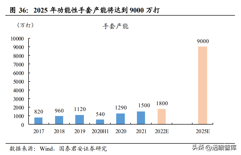 產(chǎn)能:2022 年功能性安防手套產(chǎn)能為 1800 萬打,2023-2024 年恒越 產(chǎn)業(yè)園(一期)產(chǎn)能將陸續(xù)投放,假設(shè)分別投放 2400、2400 萬打,因此總產(chǎn)能預(yù)計分別達(dá)到 1800、4200、6600 萬打。