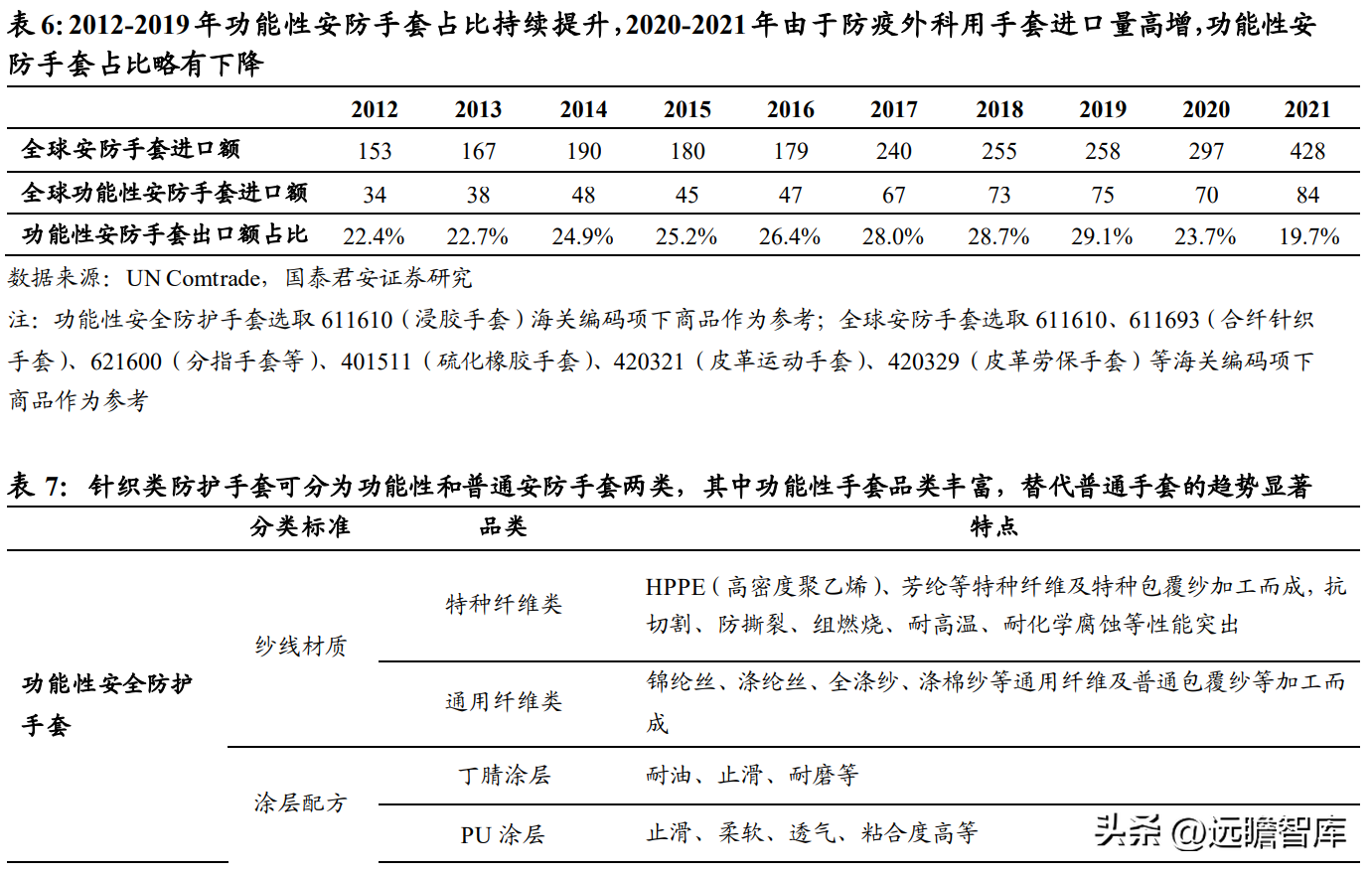 根據(jù)聯(lián)合國商品貿(mào)易統(tǒng)計數(shù)據(jù),2012-2021 年安防手套進口額由 153 億美元快速增長至 428 億美元,CAGR 為 12.1%,其中 2021 年功能性安防手套進口額同比增長 19.5%至 84 億美元,占安防手套進口額的 20%。