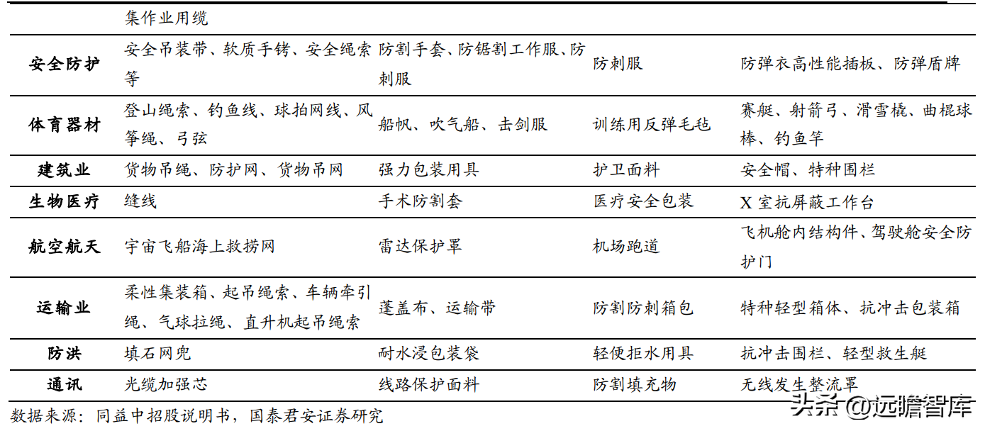 UHMWPE 纖維性能優(yōu)越,下游應(yīng)用場景廣泛。UHMWPE 纖維,即超高分子量聚乙烯纖維,指分子量在 100-500 萬的聚乙烯所制成的纖維,與碳纖維、芳綸纖維合稱為“三大高性能纖維”,是目前世界上比強度和比模量高的纖維,既可應(yīng)用于安防手套、體育器材等民用領(lǐng)域,也可廣泛應(yīng)用于軍工裝備、航空航天等軍用領(lǐng)域。