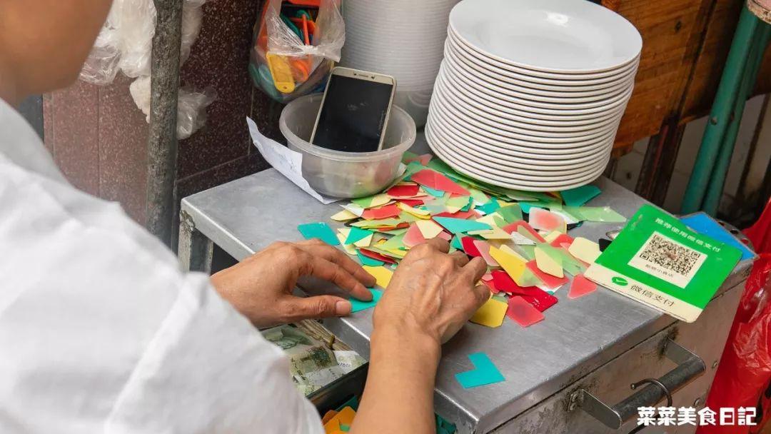 老店不存在小票,還在用著彩色的幾何小卡片溝通收銀與廚房。盡管吃了這么多年,我也還沒(méi)搞懂每塊小牌子代表什么。