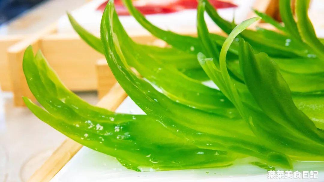 這里的翡翠,其實(shí)是苦瓜。刨刀刮出漂亮的鳳尾,提前處理過(guò)的苦瓜像翡翠一樣晶瑩剔透。