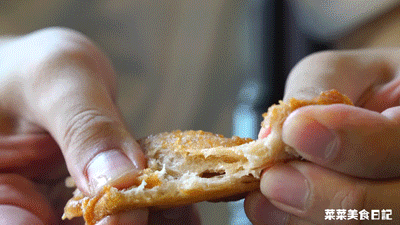 咸煎餅的形狀像肚臍眼,中間的薄薄一層酥皮,筷子一戳,咔呲一聲餅皮裂開。