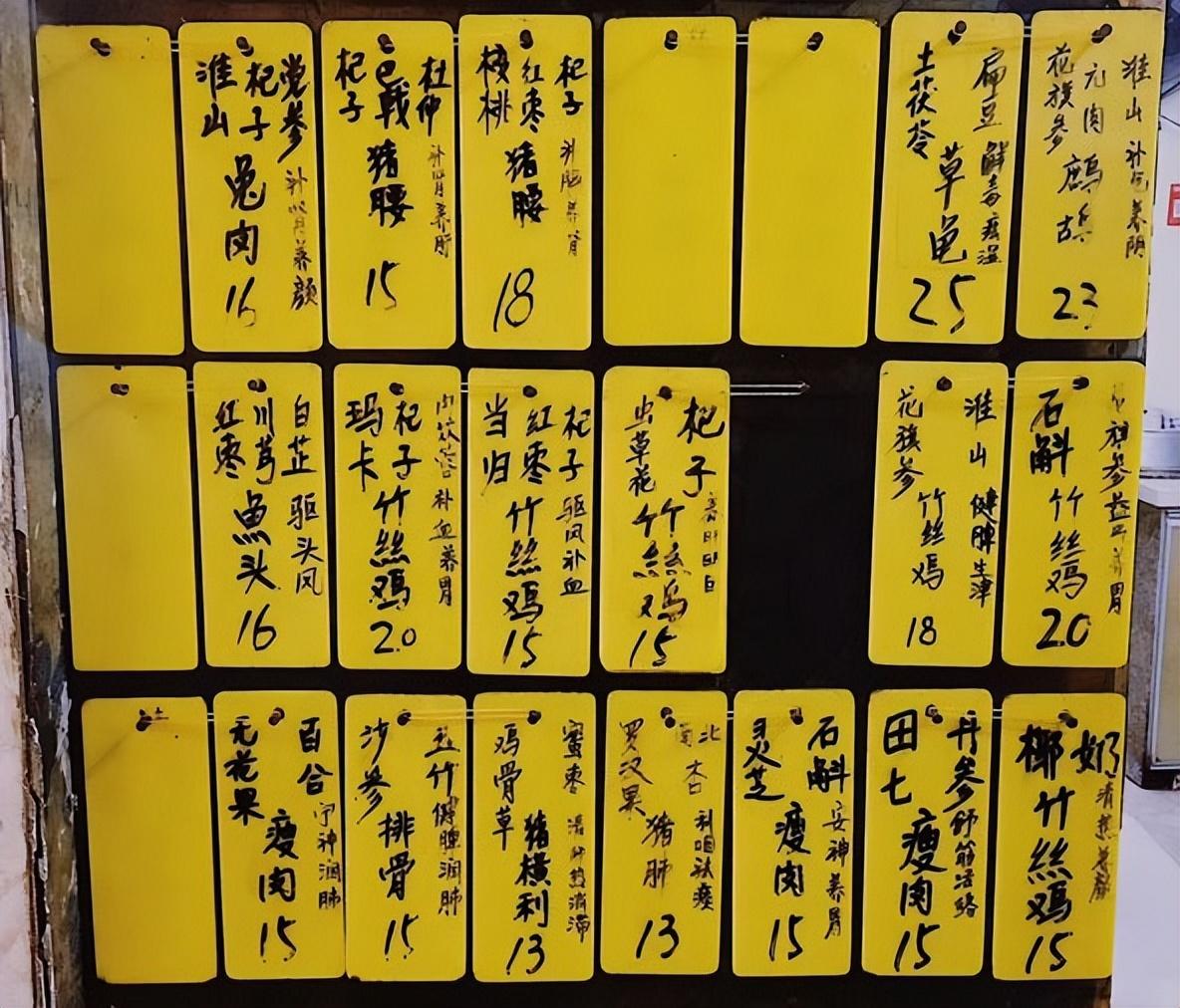 他們家的燉品品種多,門口掛著手寫的菜單牌子,密密麻麻。
