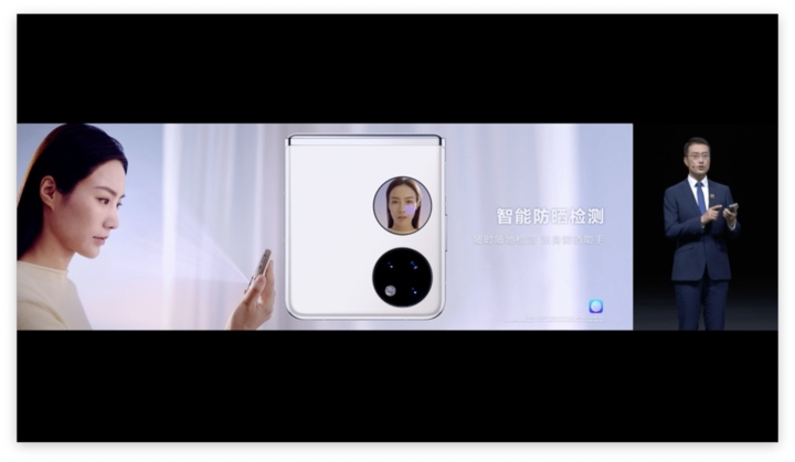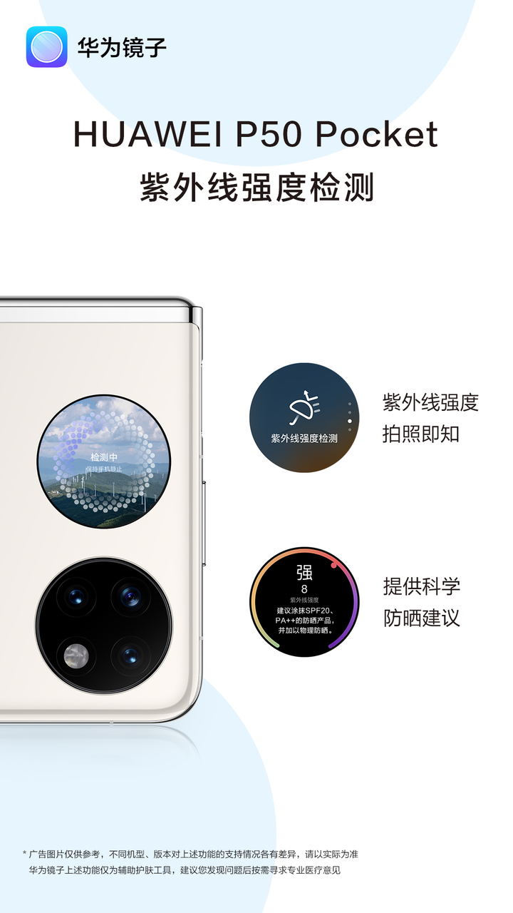 早上,根據(jù)室外和所處場景的紫外強(qiáng)度數(shù)據(jù),手機(jī)會智能提醒用戶紫外線指數(shù),并建議用戶去涂抹相應(yīng)指數(shù)的防曬霜。華為鏡子的「防曬檢測功能」可以基于 P50 Pocket 的超光譜成像系統(tǒng),將涂抹后的化學(xué)防曬霜可視化成像,從而幫助用戶判斷防曬涂抹狀態(tài)。
