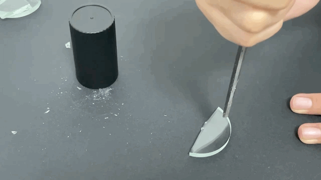 特意找來一塊鋼化玻璃進行試驗,可以看到,擰開的傘柄,輕輕松松就把玻璃壓碎。