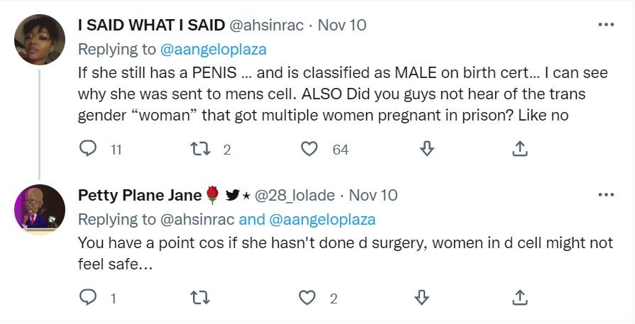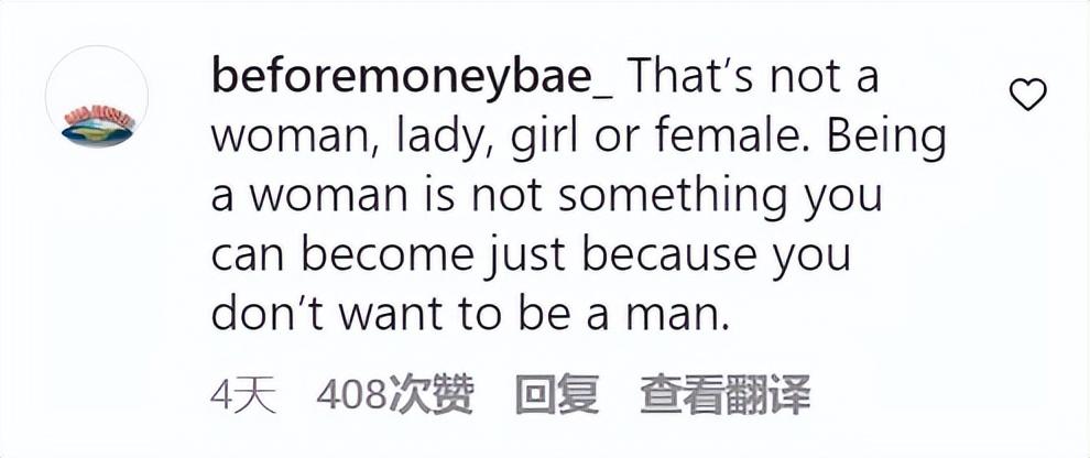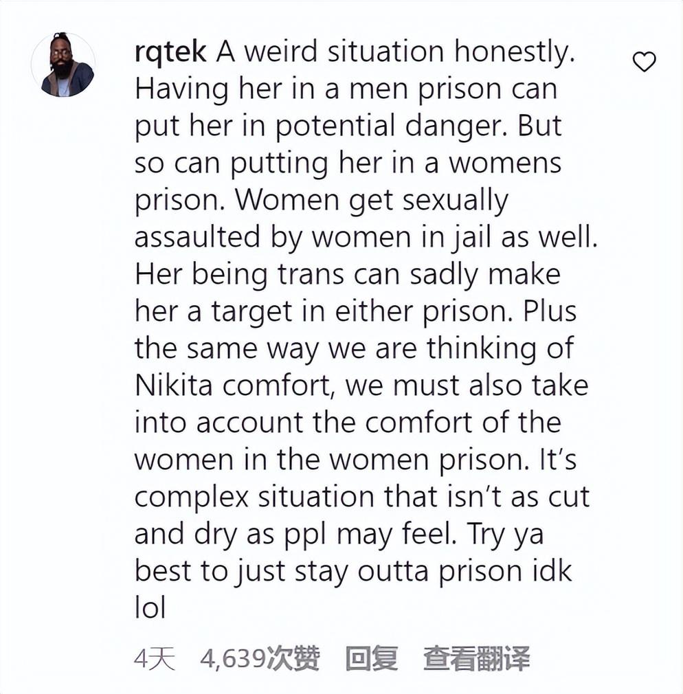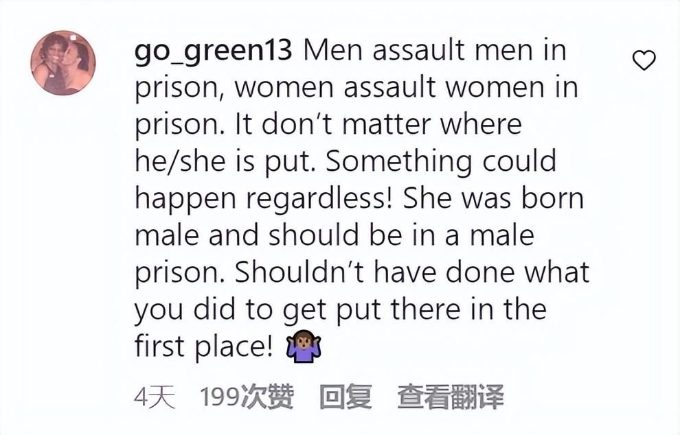 有人提到在美國(guó)監(jiān)獄,去哪里都危險(xiǎn),所以沒(méi)差別?!霸诿绹?guó)監(jiān)獄,男人侵犯男人,女人侵犯女人,把他/她關(guān)哪里都沒(méi)差別。無(wú)論如何總會(huì)發(fā)生一些事!他出生時(shí)是個(gè)男人,那就應(yīng)該被當(dāng)作男人來(lái)對(duì)待。從一開(kāi)始就不應(yīng)該做犯罪的事呀!”