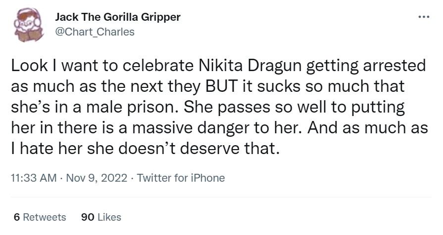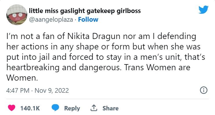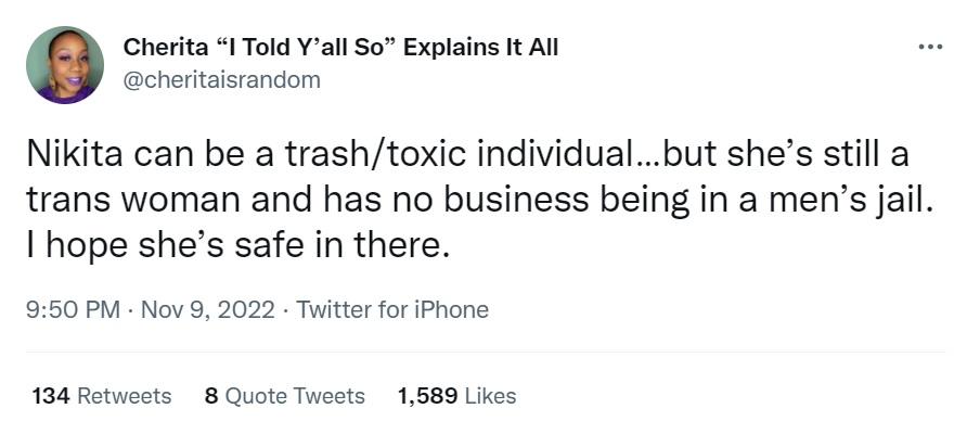 “尼基塔是垃圾,她確實(shí)有毒……但是她仍然是一個(gè)跨性別女,怎么可以把她放到男子監(jiān)獄。真希望她在那里沒(méi)事?!?/span>