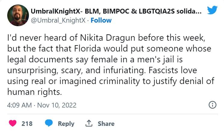 “這周之前,我從來(lái)沒(méi)聽(tīng)說(shuō)過(guò)尼基塔這個(gè)人,但佛羅里達(dá)州敢把一個(gè)法律文件上寫著是女性的人送到男子監(jiān)獄,實(shí)在是恐怖、令人憤慨,但同時(shí)又意料之中。法西斯們就喜歡用或真實(shí)或想象的罪行,來(lái)為剝奪人權(quán)辯護(hù)?!?/span>