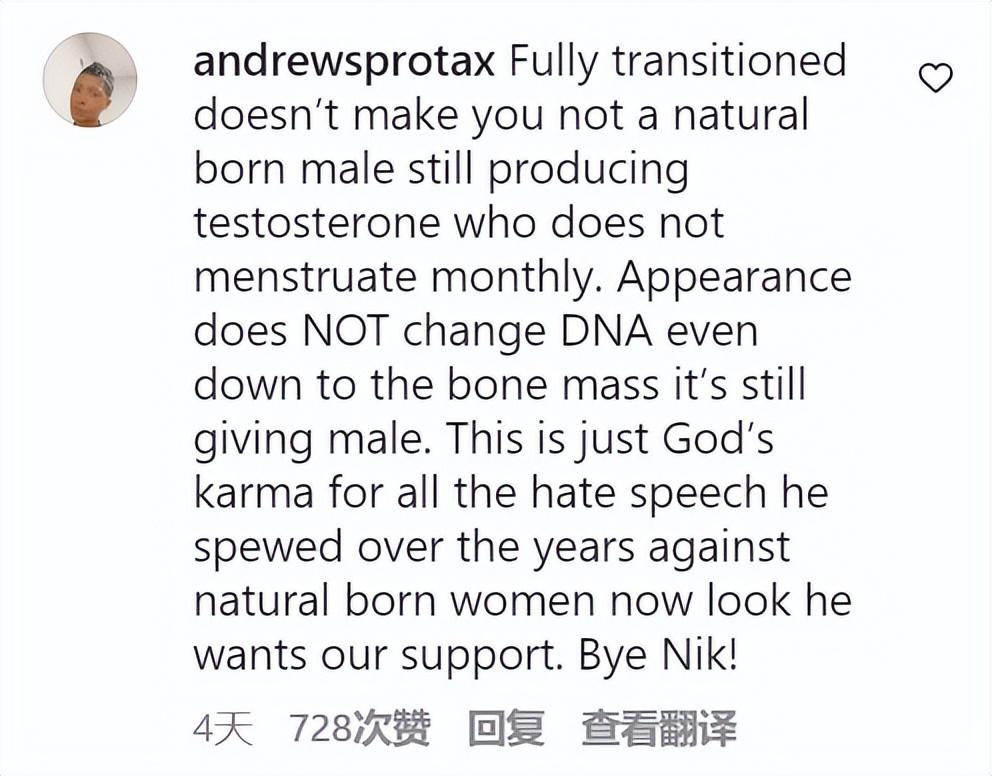 這些年,他經(jīng)常發(fā)表對(duì)自然女性的仇恨言論,如今真是天道好輪回。哈,他還想要我們的幫助。拜拜了,尼基塔?!?/span>