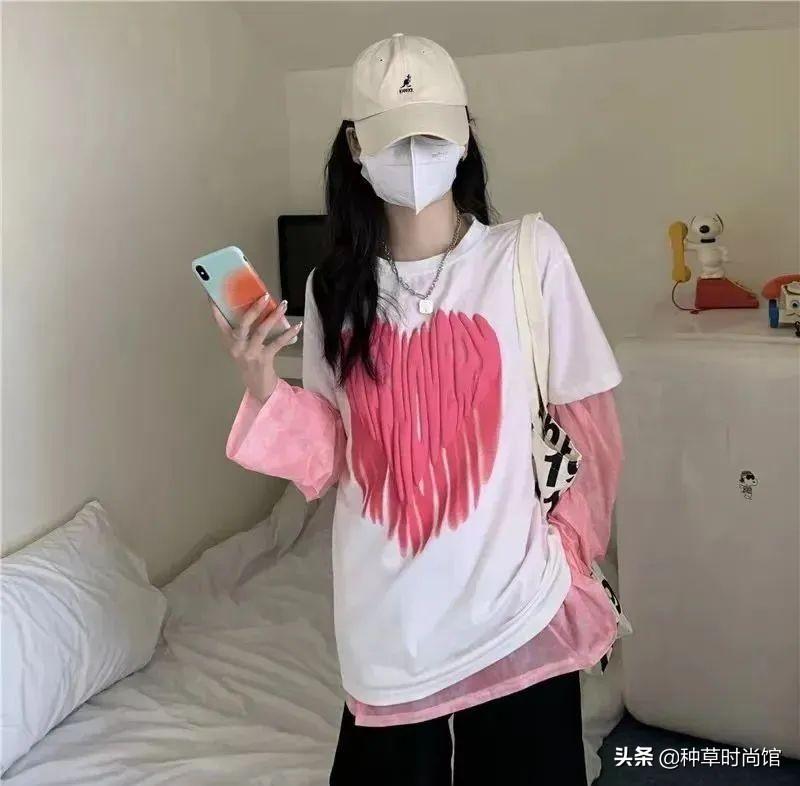 短袖和長(zhǎng)袖疊穿,袖子的粉色和胸口的粉色愛(ài)心相呼應(yīng),和諧的配色沒(méi)有違和感。