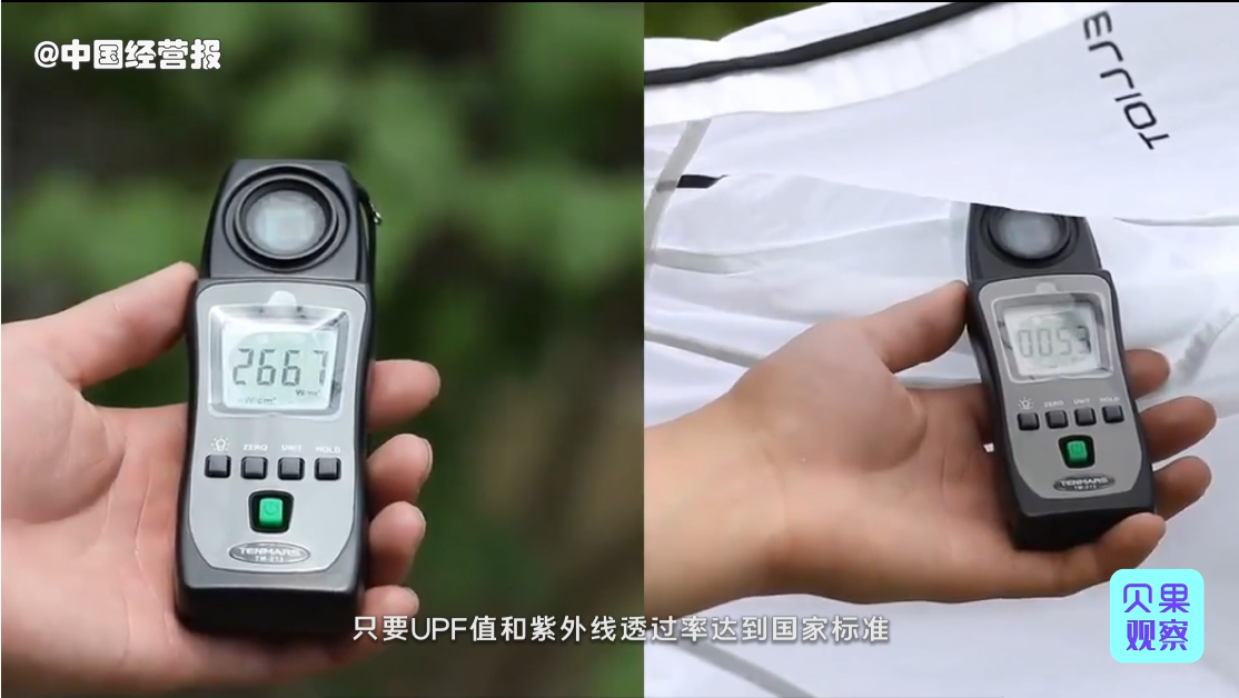 其實(shí),對于防曬產(chǎn)品,是有標(biāo)準(zhǔn)規(guī)定的,紫外線防護(hù)系數(shù)UPF大于40,且紫外線透過率小于5%,才可稱為防紫外線產(chǎn)品。所以,防曬服并不是越貴越好,只要UPF值和紫外線透過率達(dá)到標(biāo)準(zhǔn),就可以對人體起到比較好的防護(hù)作用。