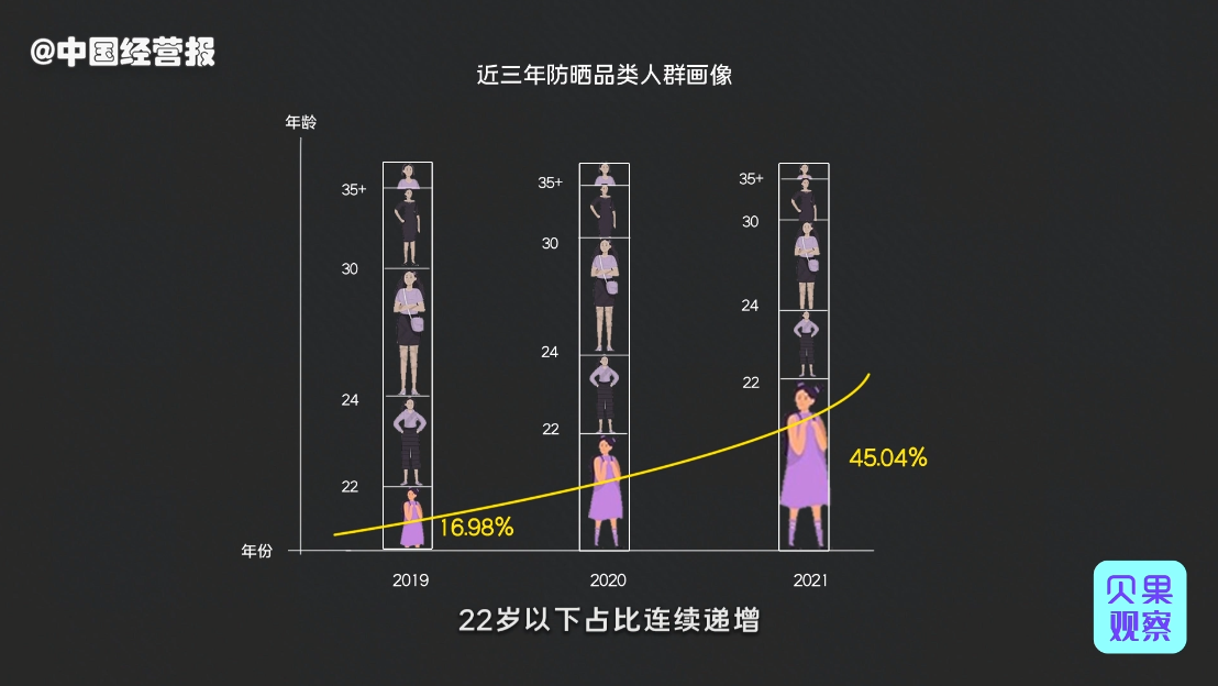 《2022年防曬行業(yè)趨勢指南》顯示,2019年至2021年,關(guān)注防曬用品的人群中,22歲以下占比連續(xù)遞增。如何做打動年輕人的防曬產(chǎn)品成為了商家們的必修課。