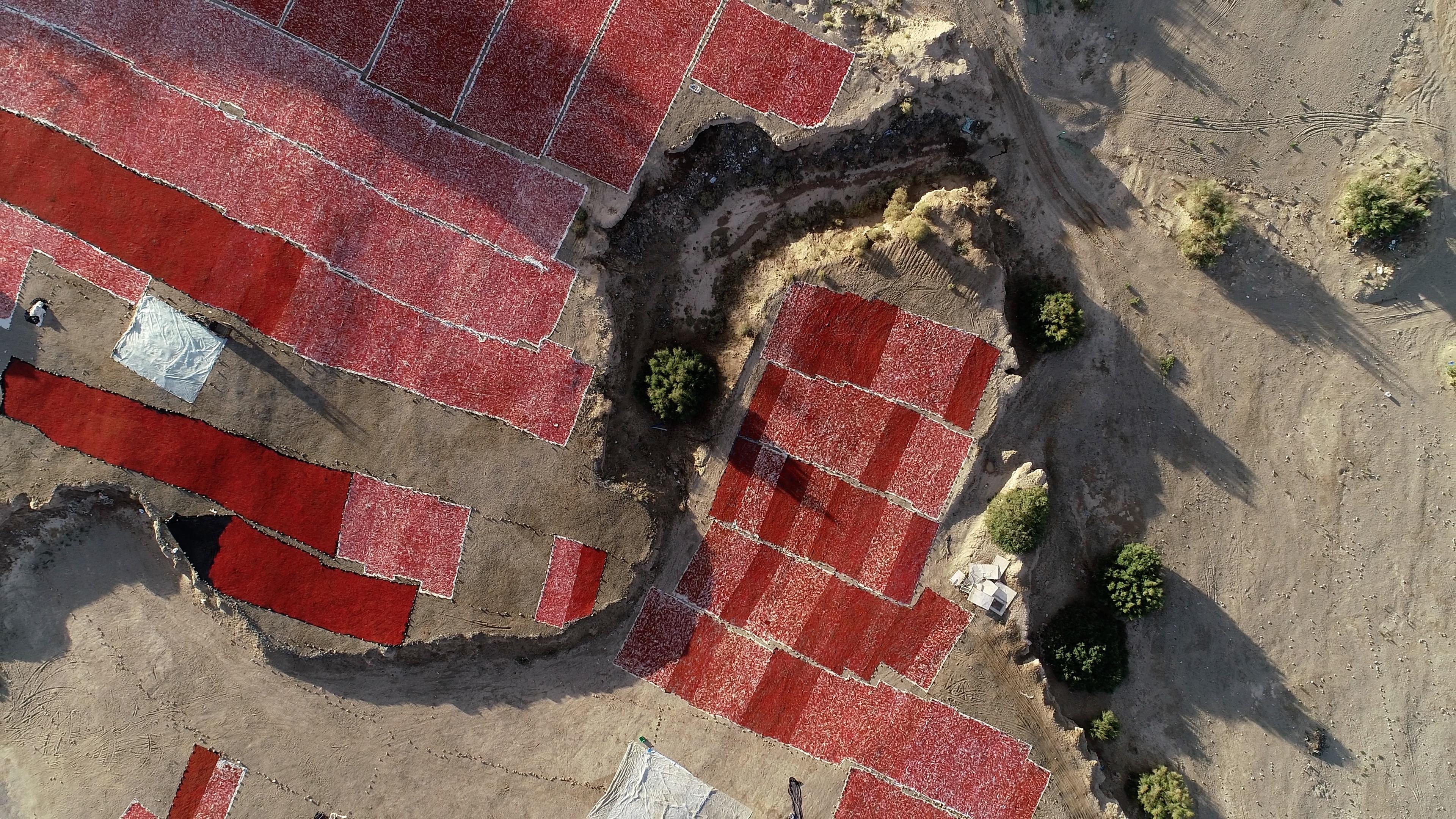 不同于新疆葡萄干陰干,枸杞需要在太陽底下暴曬。剛采摘下來的新鮮枸杞需要立即運(yùn)到晾曬場,經(jīng)過幾天晾曬,自然脫水,鮮果變成了果干。