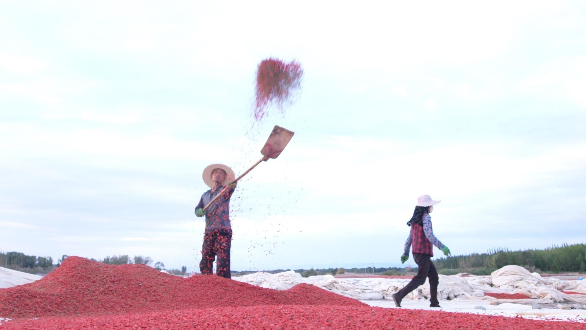 傍晚,起風(fēng)了。小哥臉上帶著豐收的喜悅,將枸杞撒向空中,讓風(fēng)把葉片吹走。反復(fù)多次,留下的只有枸杞。
