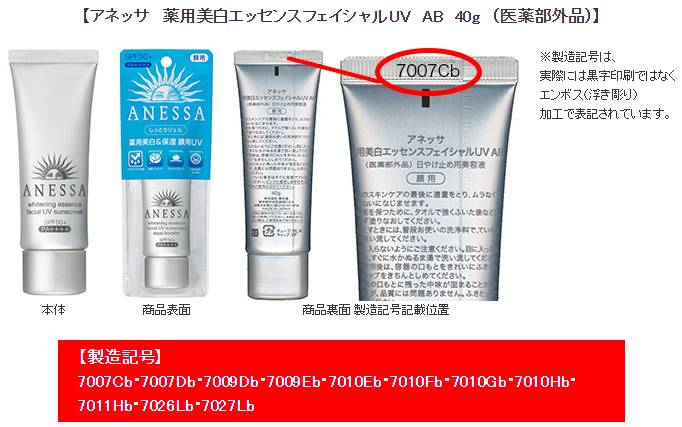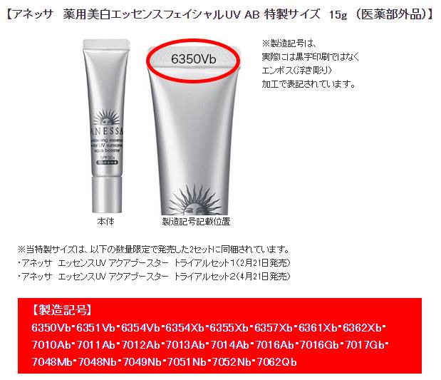 而另一款要回收的防曬霜就是國人熟悉的安耐曬了。這款安耐曬美白防曬霜是面部專用的,40g一支。不僅在日本本國販賣,超高的人氣也使它走向了海外。大家快對(duì)照下圖的制造編碼,檢查一下有木有中獎(jiǎng)?